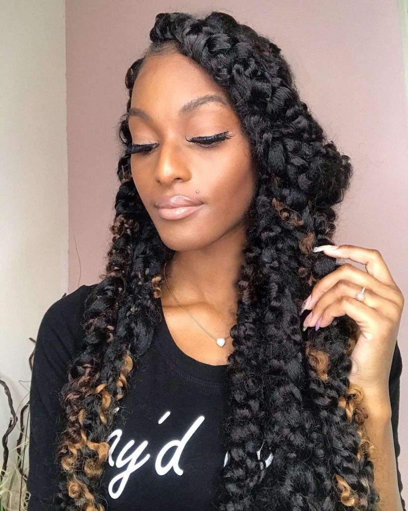 Then, the spring twist or water wave hair is looped through your cornrows using a crochet needle, creating those beautiful, flowing Passion Braids. The installation time can vary but generally takes a few hours, depending on the length and volume you desire.