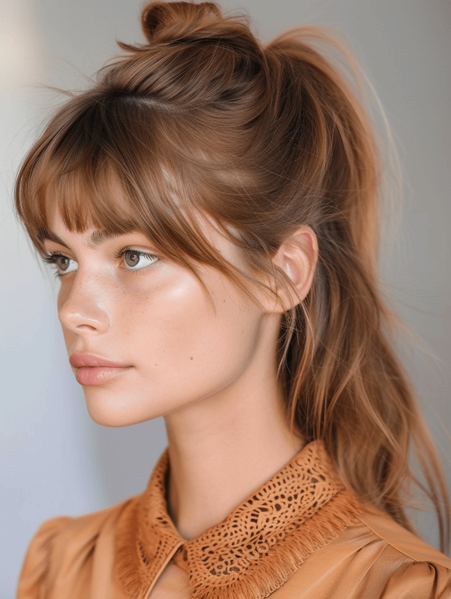- Wispy Bangs: Soft, delicate, and easy to style, they offer a romantic touch to any ponytail.